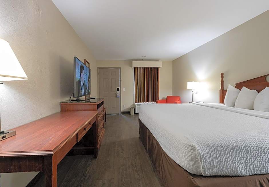 This room features a small refrigerator, microwave, and cable television.